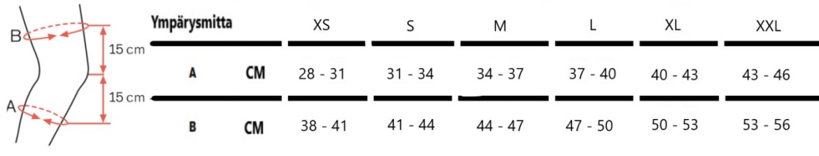 Kokotaulukko: Valitse koko mittaamalla ympärysmitta 15 cm polven yläpuolelta (B) ja 15 cm polven alapuolelta (A)
